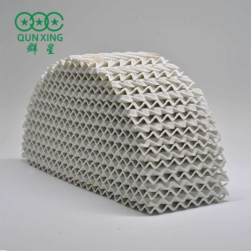 活性陶瓷波紋填料是一種以萍鄉(xiāng)特產(chǎn)質(zhì)量很好的高嶺土為主要原料、添加一定量的鋁質(zhì)粘土、石英等原材料,經(jīng)配料、真空練泥、擠出成型、修坯、一次干燥、二次干燥、高溫煅燒、選瓷等幾個過程。活性陶瓷波紋填料在裝填好后氣液相傳的形式是“面”接觸,注明(散堆填料是點跟線接觸)。從而使得氣體液體的有效接觸面積大于99.5%,分離凈化吸收效果很好。